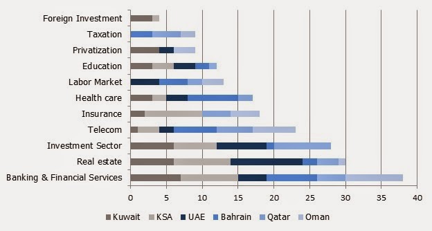 the number of reforms, sector wise in the GCC, since 2008. It is interesting to